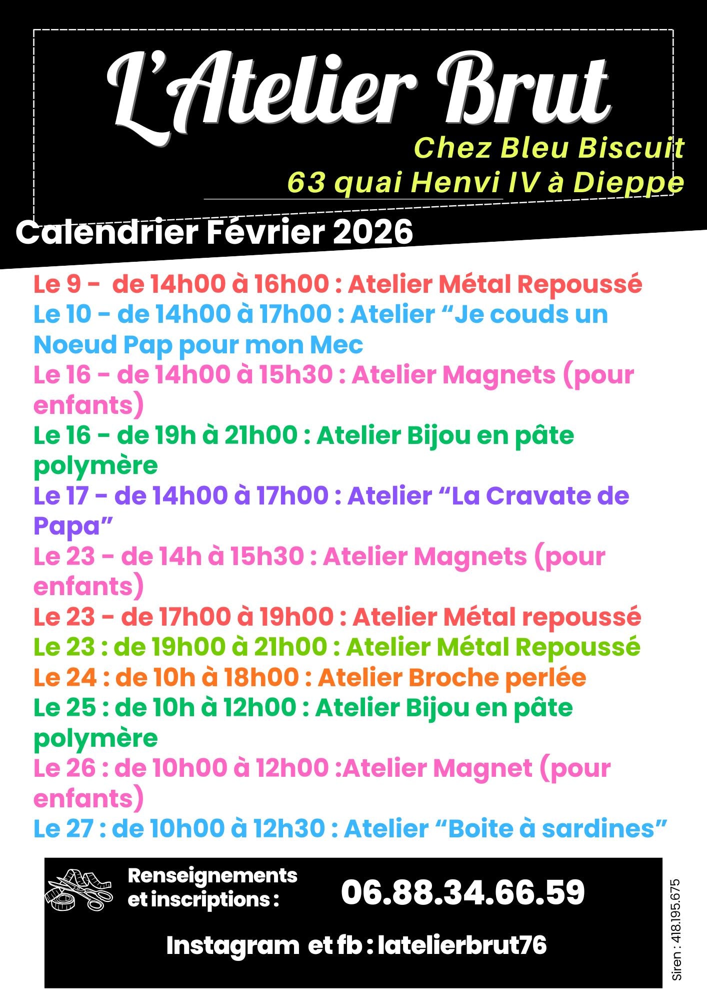 - Le 23 : Atelier Magnets (pour enfant de 4 à 12 ans), de 14h à 15h30, chez BLEU BISCUIT à Dieppe (76200)